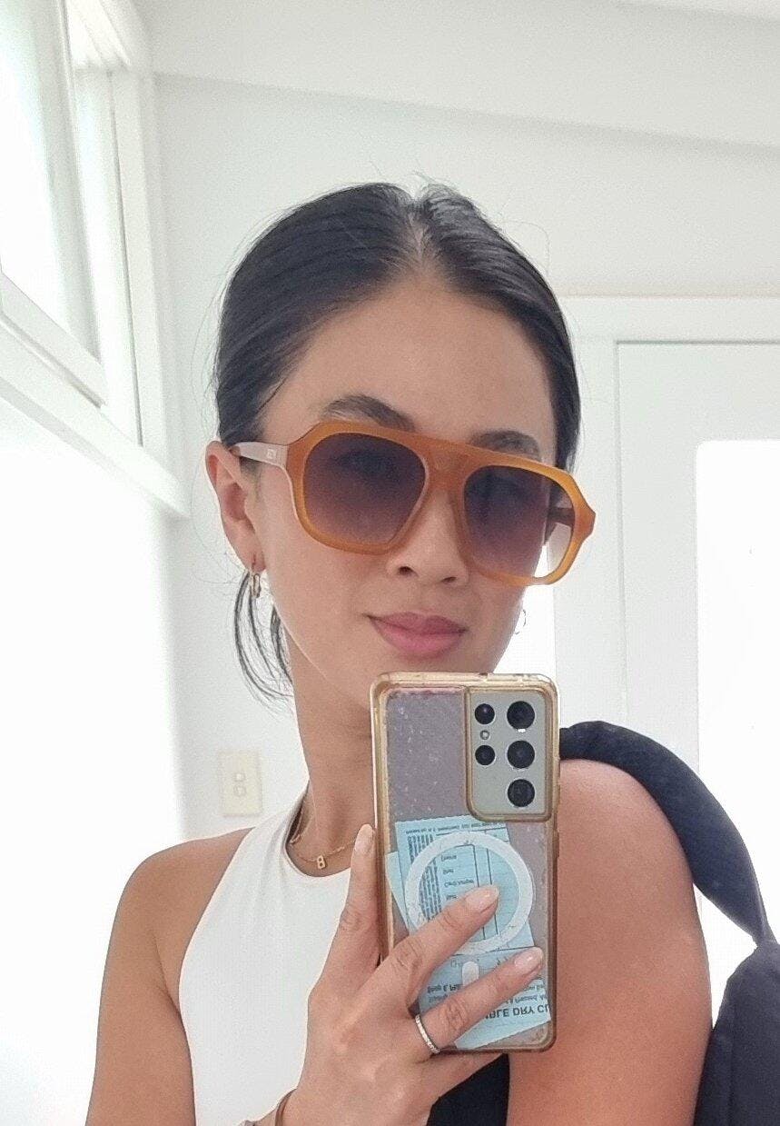 Yue in Amber softens the sharp aviator silhouette with warmth and glow, like golden hour, but wearable. The semi-translucent frame makes a statement without the weight, pairing effortlessly with neutrals, denim, and earthy tones. Bold, but easy.